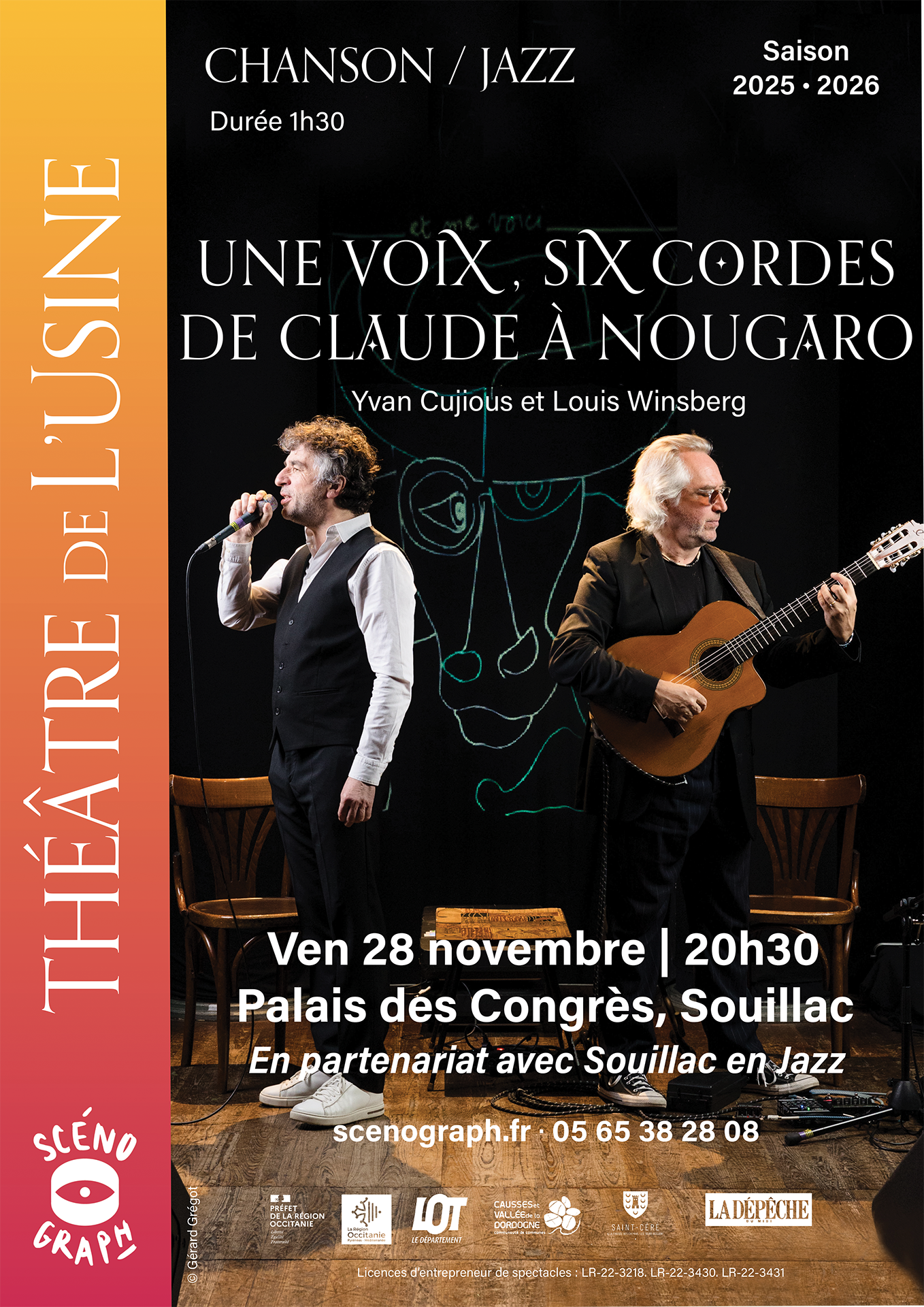 Dans le cadre de la saison 2025/2026 du Théâtre de l’Usine de Saint-Céré, en partenariat avec Souillac en Jazz, découvrez le concert Une Voix, Six Cordes, de Claude à Nougaro, avec Yvan Cujious et Louis Winsberg.