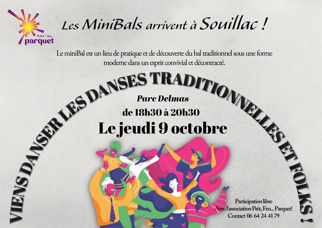 Les « miniBals » portés par l’association Prêt-Feu-Parquet ! ont pour objectifs de promouvoir, de faire découvrir et d’approfondir les danses et les musiques du bal traditionnel sous une forme moderne dans un esprit convivial et décontracté. Avec leur petit format de 2h en début de soirée et des musicien(ne)s de tous niveaux qui viennent tester leurs morceaux avec les danseur(euse)s, ils sont faciles à organiser régulièrement, rendant ainsi accessible l’univers du bal trad aux locaux.
